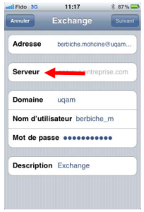 Configuration sous Apple (iPhone et iPad)Courriel ExchangeAvertissement : Veuillez prendre note que les appareils de type téléphone intelligent et les tablettes PC ne sont pas supportés par les Services informatiques et que les procédures de branchement sont fournies à titre informatif seulement. | |