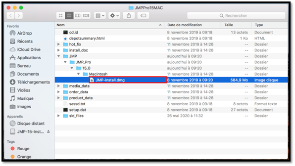 3. Aller dans le dossier: JMPPro15_MACOS--->JMP--->JMP_Pro--->15_0--->Macintosh puis double cliquer sur le fichier JMP-Install.dmg | |