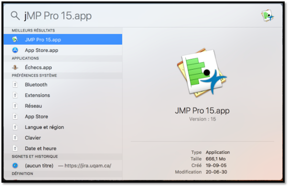 Guide d'aide à l'installation du programme JMP Pro 15 sous Macintosh. Le téléchargement est disponible sur https://logitheque.uqam.ca/logiciel/jmp15pro/ Si vous éprouvez des difficultés lors de l'installation, et vous êtes