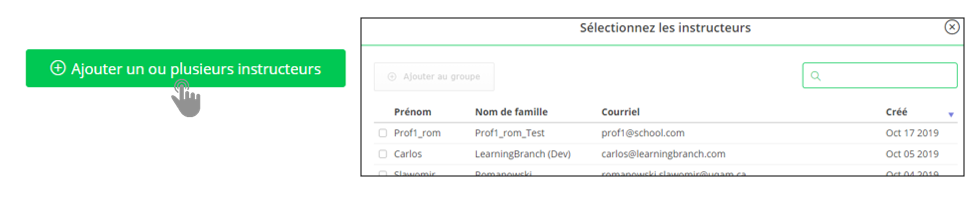 Cliquez sur « Ajouter un ou plusieurs instructeurs » et cherchez les instructeurs dans la boite de recherche.