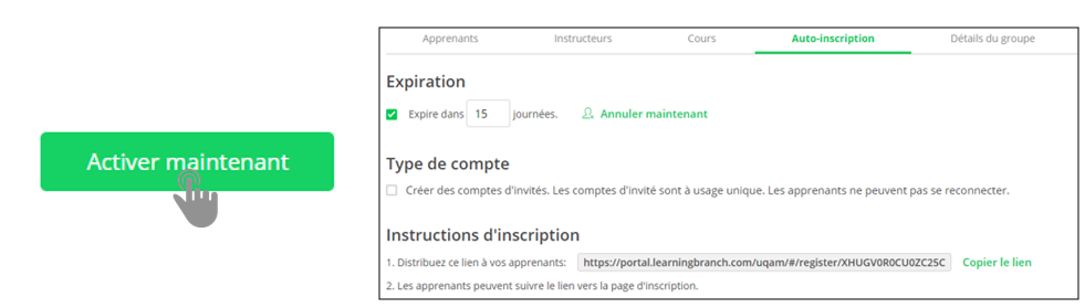 En activant cette option, Learning Branch créera un lien, d’une durée spécifique, que le professeur enverra aux étudiants et qui permettra au processus d’inscription de faire : la création du compte de l’utilisateur et l’enregistrement à ce groupe.