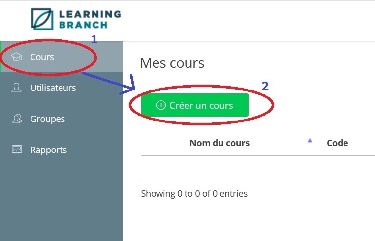 Dans le menu de gauche, appuyez sur « Cours » par la suite, appuyez sur « Créer un cours ».