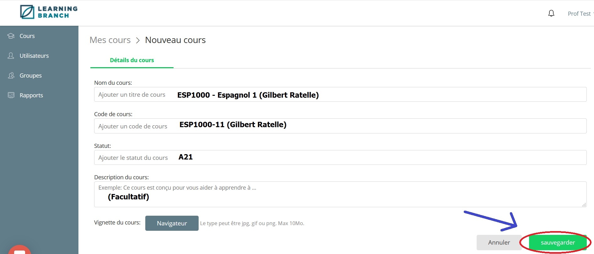 Dans le champ « Nom du cours », vous devez entrer : le sigle du cours suivi du titre du cours suivi du nom de l’enseignant entre parenthèses. (voir l’exemple) ;