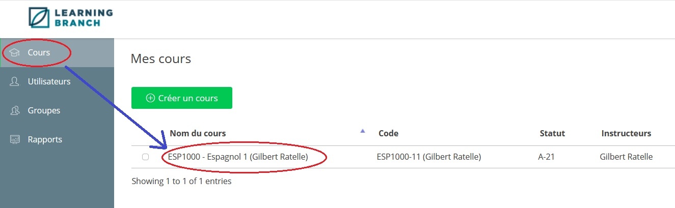 • sélectionner « cours » sur le menu principal, à gauche ;
