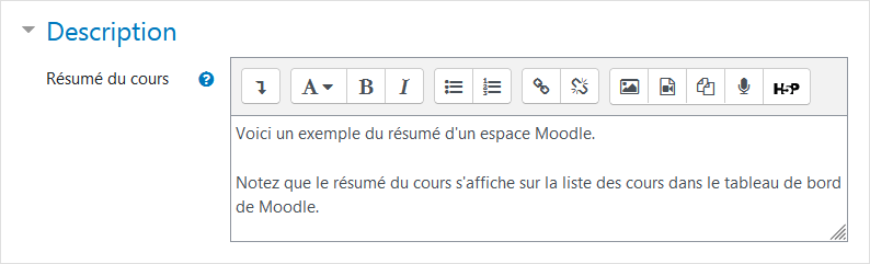 Le bloc Résumé du cours ou Résumé du cours/site affiche le résumé de l'espace Moodle (cours, projet ou programme) tel qu’il figure dans le champ Résumé des Paramètres du cours.