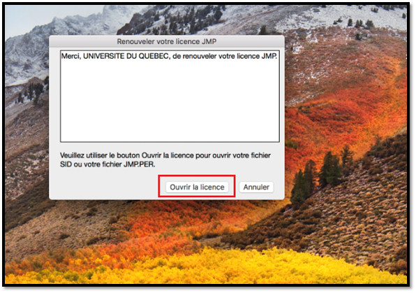 Guide de renouvellement de licence du programme JMP Pro 15 sous macOSLe renouvellement de la licence est disponible sur https://logitheque.uqam.ca/logiciel/jmp15-updkey/ Si vous éprouvez des difficultés lors de l'installation, et vous êtes