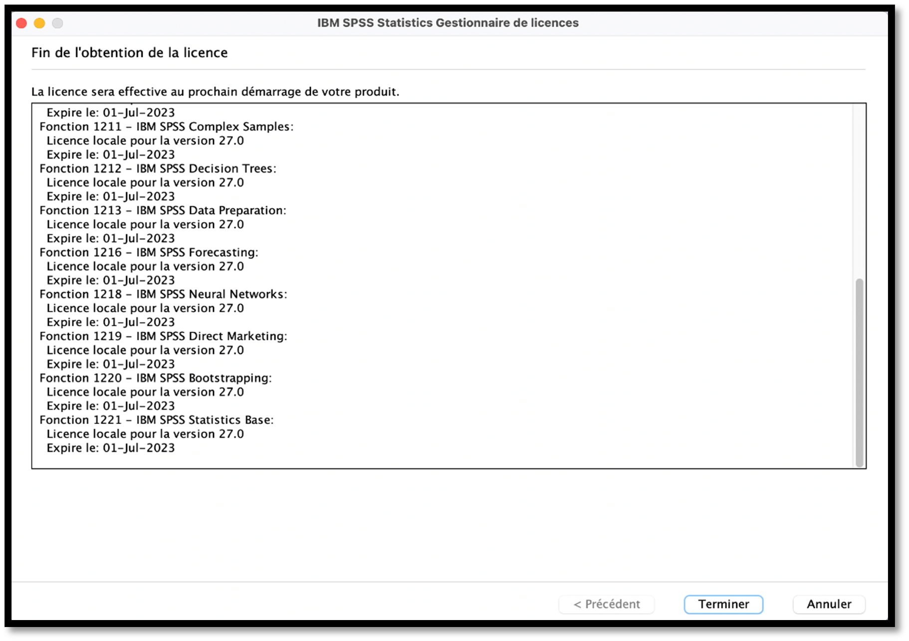 8. Cliquer sur Terminer 9. Noter que la nouvelle licence est valide jusqu'au 1er juillet 2025 |