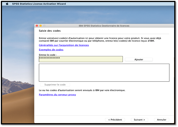 6. Entrer le code d'activation. Cliquer ici pour récupérer le code. | |