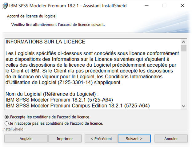 4. À l'écran Licence d'utilisation du Logiciel - lire les conditions d'utilisation et choisir J'accepte les conditions de l'accord de licence et appuyer sur le bouton Suivant. | |