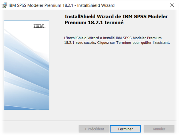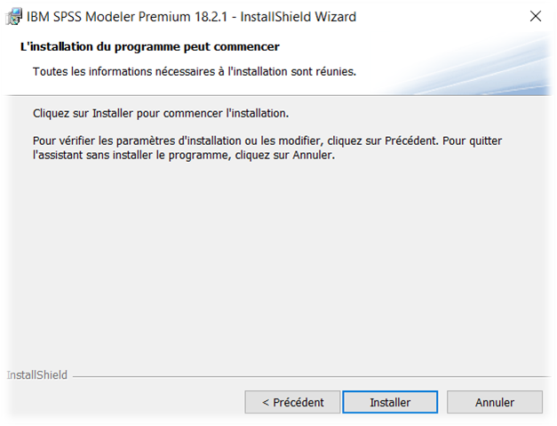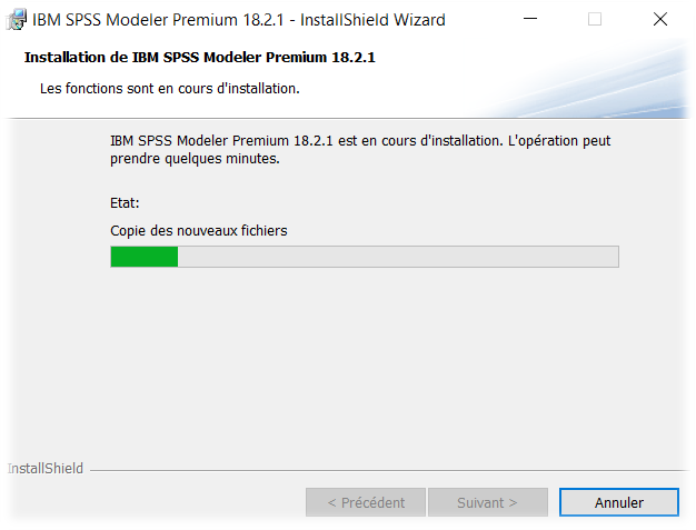 7. L'installation de SPSS Modeler est en cours et le processus devrait durer plusieurs minutes. | |