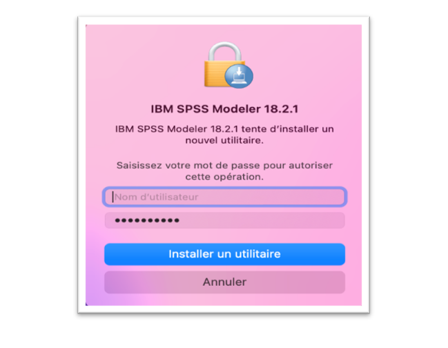 3. À l'écran IBM SPSS Modeler - Entrer votre nom d'utilisateur et votre mot de passe du MAC puis cliquer sur  Installer un utilitaire.