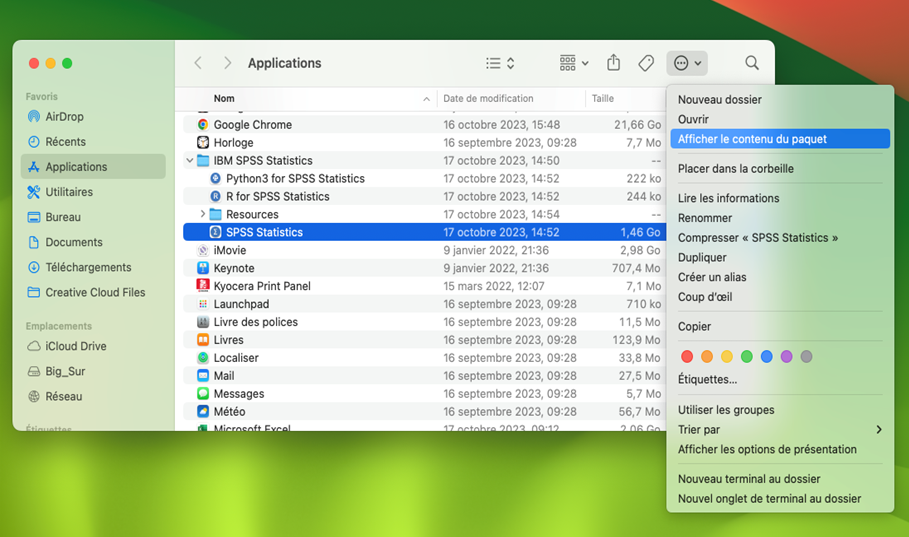 4. Ouvrir le dossier IBM SPSS Statistics. 5. Sélectionner SPSS Statistics, puis cliquer sur la flèche du petit cercle situé en haut à droite. (Voir illustration) 6. Cliquer sur Afficher le contenu du paquet. | |