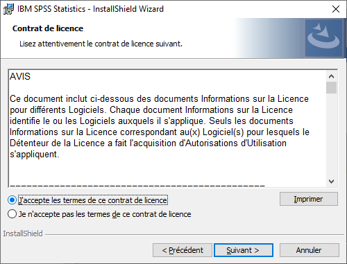 3. À l'écran Licence d'utilisation du Logiciel - lire les conditions d'utilisation et choisir J'accepte les dispositions du contrat de licence et appuyer sur le bouton Suivant