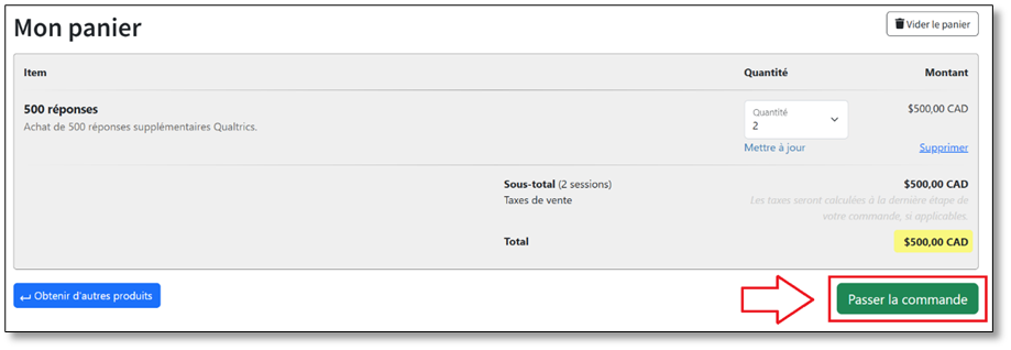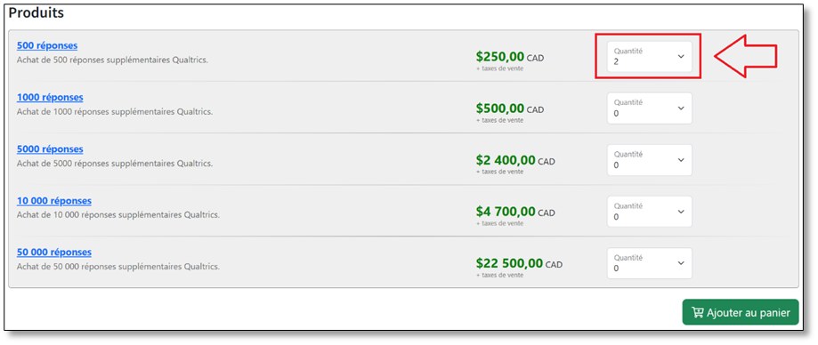 Cliquez sur le menu déroulant Quantité de l'item que vous souhaitez acheter et sélectionnez la quantité de réponses à acheter. Puis, cliquez sur le bouton Ajouter au panier.
