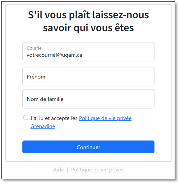 Entrez votre Prénom et Nom de famille, et cochez la case J’ai lu et accepte les Politiques de vie privée Grenadine. Puis, cliquez sur Continuer.