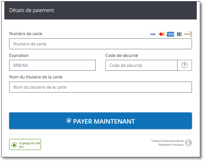 Une fenêtre s’affichera et vous invitera à fournir vos coordonnées. Entrez les données en lien avec la carte de crédit avec laquelle vous paierez: