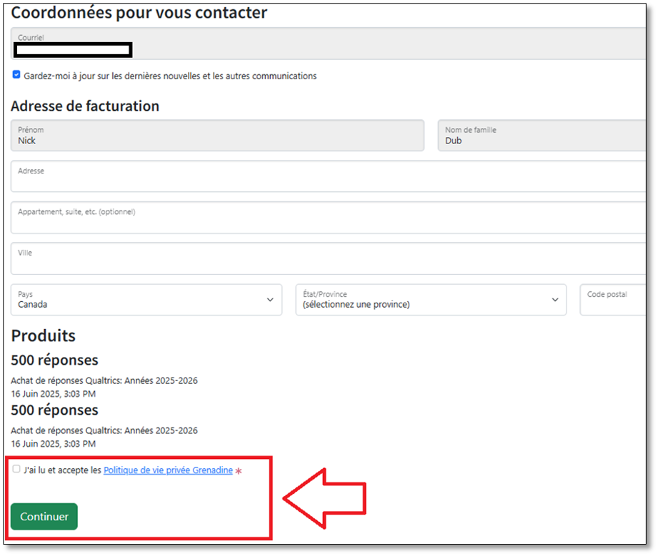 Cochez la case J’ai lu et j’accepte les Politiques de vie privée de Grenadine, puis cliquez sur Continuer.