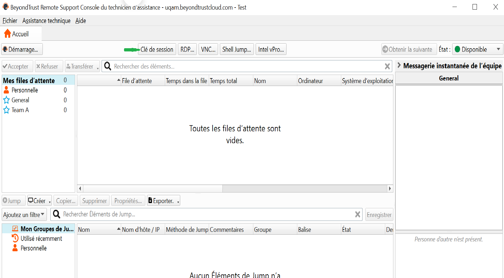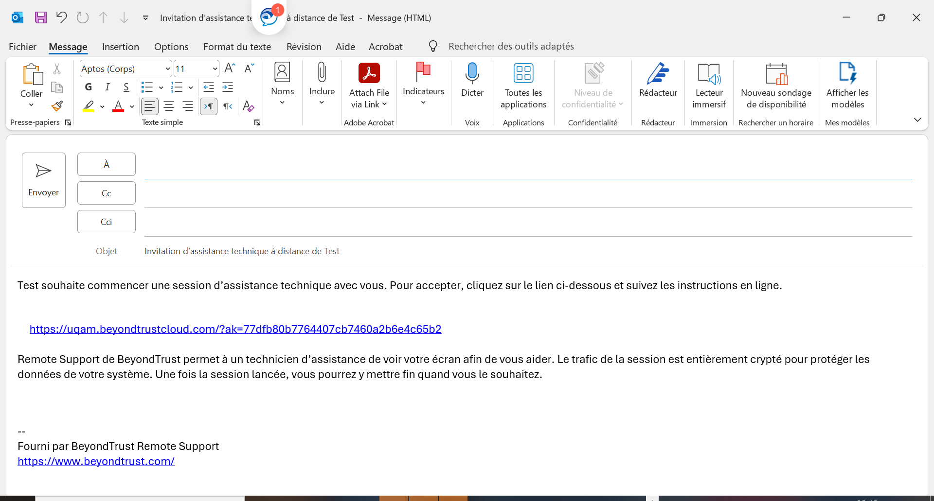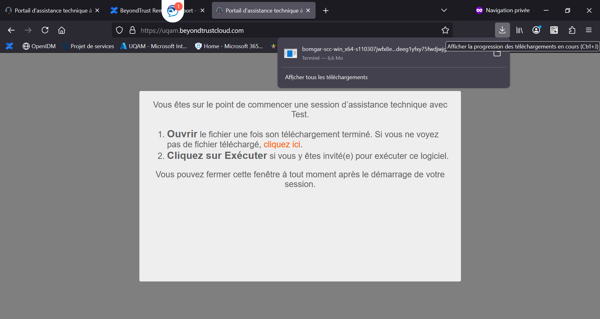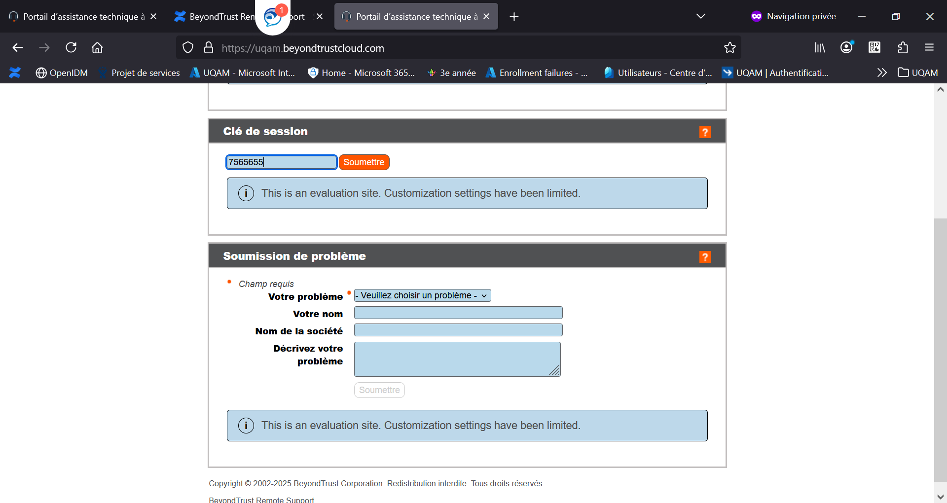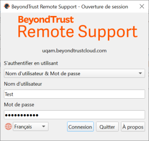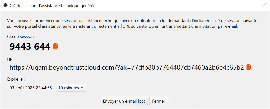 vous pouvez envoyer un courriel à l'utilisateur en cliquant sur "Envoyer un e-mail local" ou bien demander à l'utilisateur d'accéder à la page : https://uqam.beyondtrustcloud.com/ et de mettre la clé de session