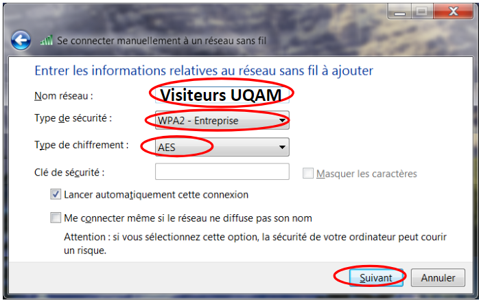 • Vérifiez qu'à l'étape 6, le nom du réseau Visiteurs UQAM est bien inscrit et respectez les majuscules et les minuscules.