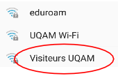 2. Pour configurer le réseau sans fil Visiteurs UQAM sur votre appareil mobile, vous devez avoir votre nom d'utilisateur et le mot de passe associé. Ils sont habituellement fournis par votre parrain ou par l'organisateur d'événement. Sélectionnez le réseau nommé Visiteurs UQAM. | |