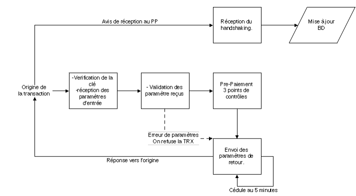 • Si l'option du « Hand Shaking » est sélectionnée dans le pré-paiement, une commande < HttpPost > sera envoyée à l'origine pour chacune des transactions à toutes les 5 minutes, tant que le pré-paiement ne recevra pas une réponse « Transaction OK » de l'origine.