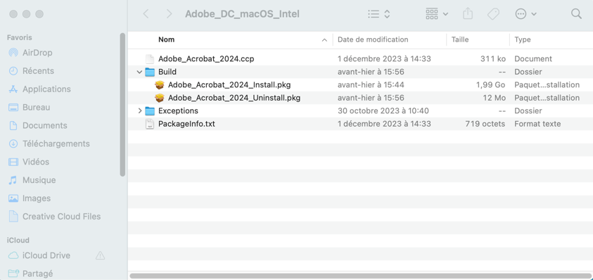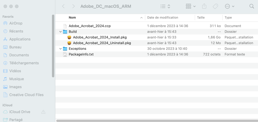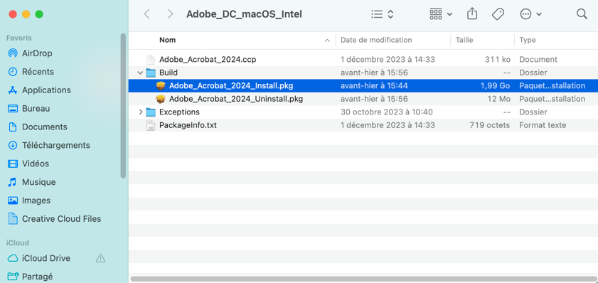 3. Aller dans le dossier Build, puis double cliquer sir le fichier: Adobe_Acrobat_2024_Install.pkg | |