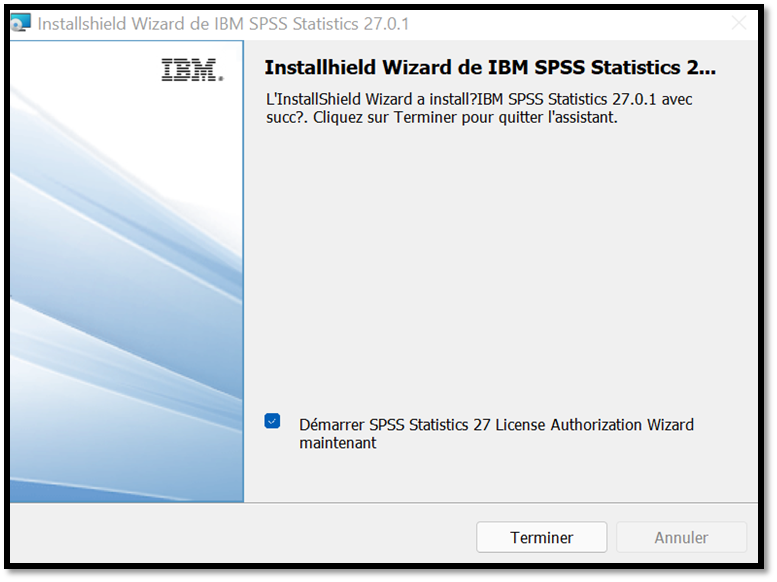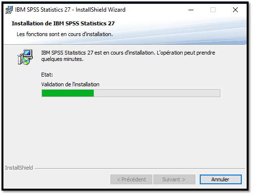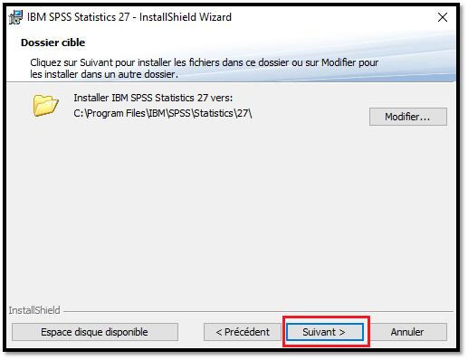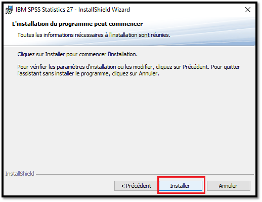 1. Double cliquer sur le fichier téléchargé SpssPck27.0.1.exe 2. À l'écran IBM SPSS Statistics - InstallShield Wizard, appuyer sur le bouton Suivant | |