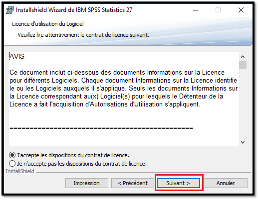 3. À l'écran Licence d'utilisation du Logiciel - lire les conditions d'utilisation et choisir J'accepte les dispositions du contrat de licence et appuyer sur le bouton Suivant | |