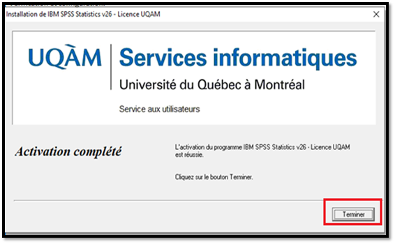 4. Cliquer sur Terminer 5. Noter que la licence de SPSS25 est valide jusqu'au 1 juillet 2021. |