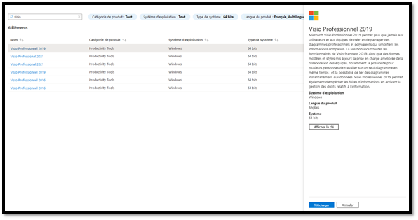 Guide d'acquisition du programme Visio Professionnel à partir du serveur Azure Dev Tools.