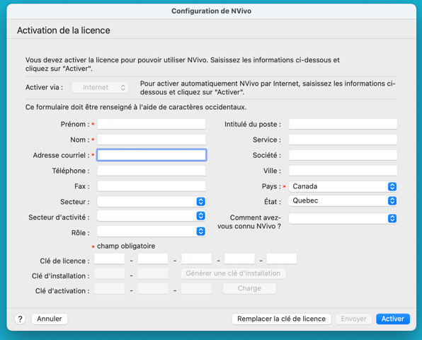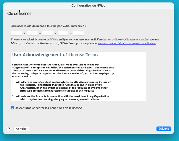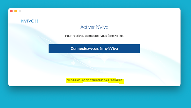 11- Entrer la clé de licence Nvivo. Cliquer ici pour récupérer la clé. | |