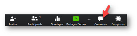 Il est également possible d’intervenir par écrit en utilisant l’option de conversation de groupe « Converser ». La participant.e peut signifier son souhait d’intervenir ou de formuler une question sous forme de texte à l’animateur.trice.