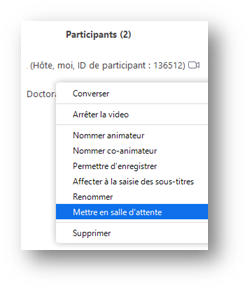 Sous la rubrique « Participants », à droite des noms, sous le bouton « Plus », il est possible de « mettre en salle d’attente » tous les participant.e.s afin qu’ils ne soient pas témoins des délibérations des membres du jury.