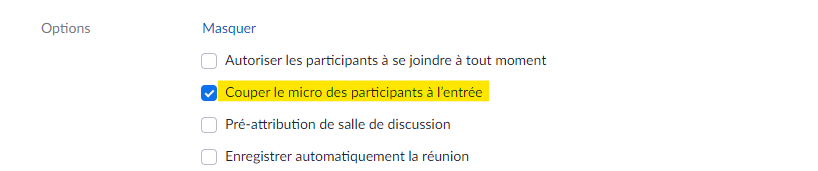 Lors de la programmation de la réunion, sous l’onglet « Options de la réunion », il est fortement recommandé de cocher les fonctions « Couper les micros des participants à l’entrée » et « Activer la salle d’attente ». Ainsi, les participant.e.s intégreront la réunion seulement lorsqu’ils sont invités et en mode silencieux par défaut.