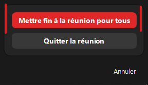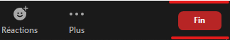 Une fois l’événement terminé, l’animateur.trice de la soutenance met fin à la rencontre en sélectionnant l’option « Fin » Puis « Mettre fin à la réunion pour tous »