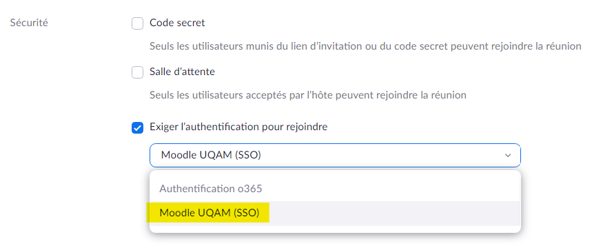 Noter que lorsque vous activez l'authentification obligatoire lors de la programmation d'une réunion seuls les comptes UQAM (*.uqam.ca et *.courrier.uqam.ca) pourront joindre votre réunion. Si vous invitez, par exemple, une conférencière externe à l'UQAM, elle ne pourra pas rejoindre votre réunion.