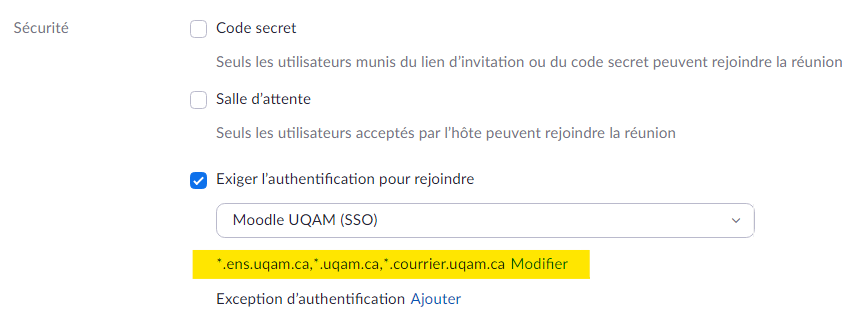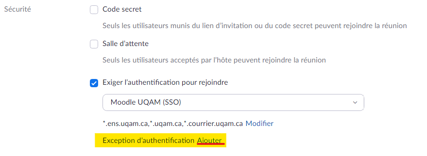 Pour ajouter un conférencier à votre réunion qui n'est pas de l'UQAM ou d'un de ses domaines (uqam.ca; courrier.uqam.ca). Vous avez la possibilité d'ajouter une exception à l'authentification, en cliquant sur « Ajouter » | |