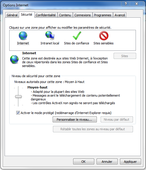 - Dans la section Niveau de sécurité pour cette zone, déplacer le curseur pour sélectionner le niveau Moyen-haut ou cliquer sur le bouton Niveau par défaut.